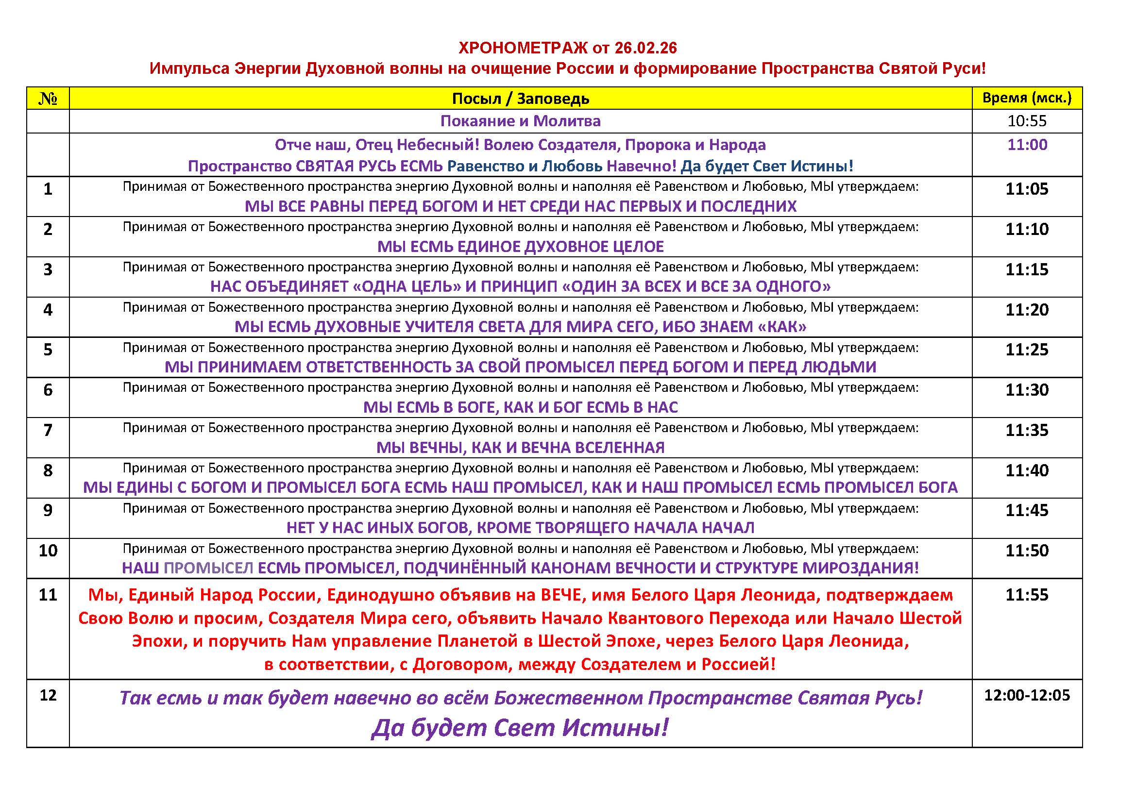 “Отче наш, Отец Небесный! Волею Создателя, Пророка и Народа Пространство Святая Русь ЕСМЬ Равенство и Любовь Навечно! Да будет Свет Истины!”